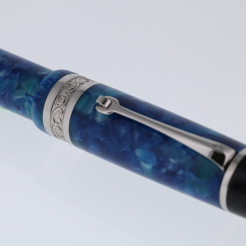 ボディには、カプリ島を取り巻く海のように、光の屈折が複雑な色彩を生むクラック系レジンを使用。フェリーチェシリーズで初となるシルバートリムが透明感のあるブルーをさらに引き立てています。天冠と尻軸には黒のレジンを配し、全体を落ち着いたトーンに仕上げました。