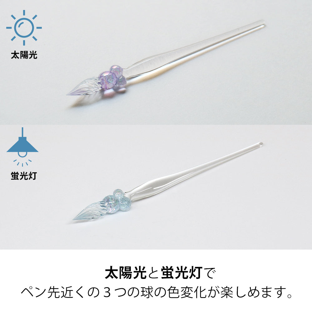 ダイクロパープルのみ、太陽光と蛍光灯でペン先近くの3つの球の色の変化が楽しめます。