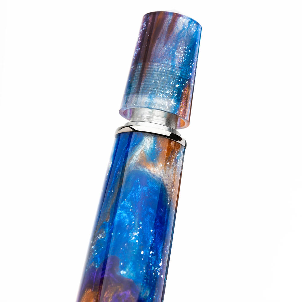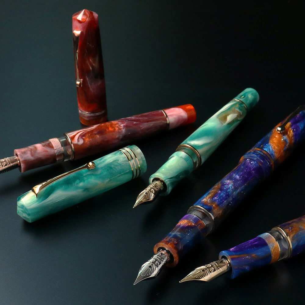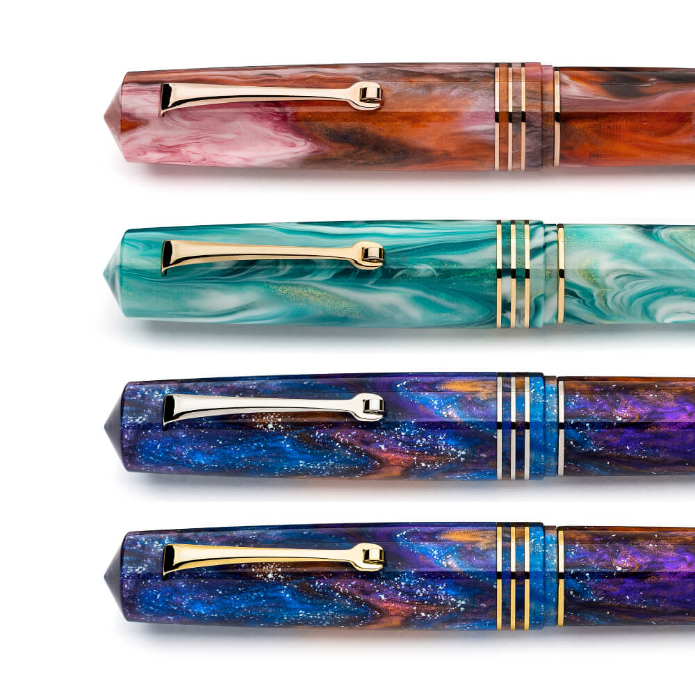 アメリカのカスタムペンメーカー「テイラードペンカンパニー」とコラボした〈モーメントゼロ グランデ2.0 ガラッティカ〉は、その名の通り「ガラッティカ」=「銀河」をイメージして製作されており、星の輝き、宇宙の深み、星座の陰影を想起させる3つのカラーバリエーションのレジンが、ヴィンテージスタイルのデザインに完璧に調和しています。 広大無辺な宇宙の色彩をイタリアの職人技で表現した意欲作です。