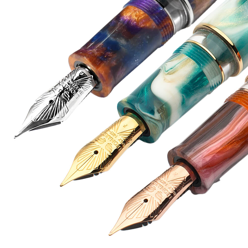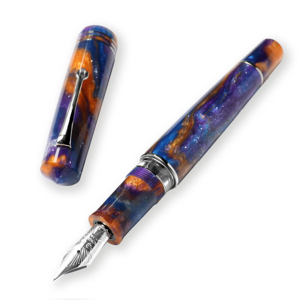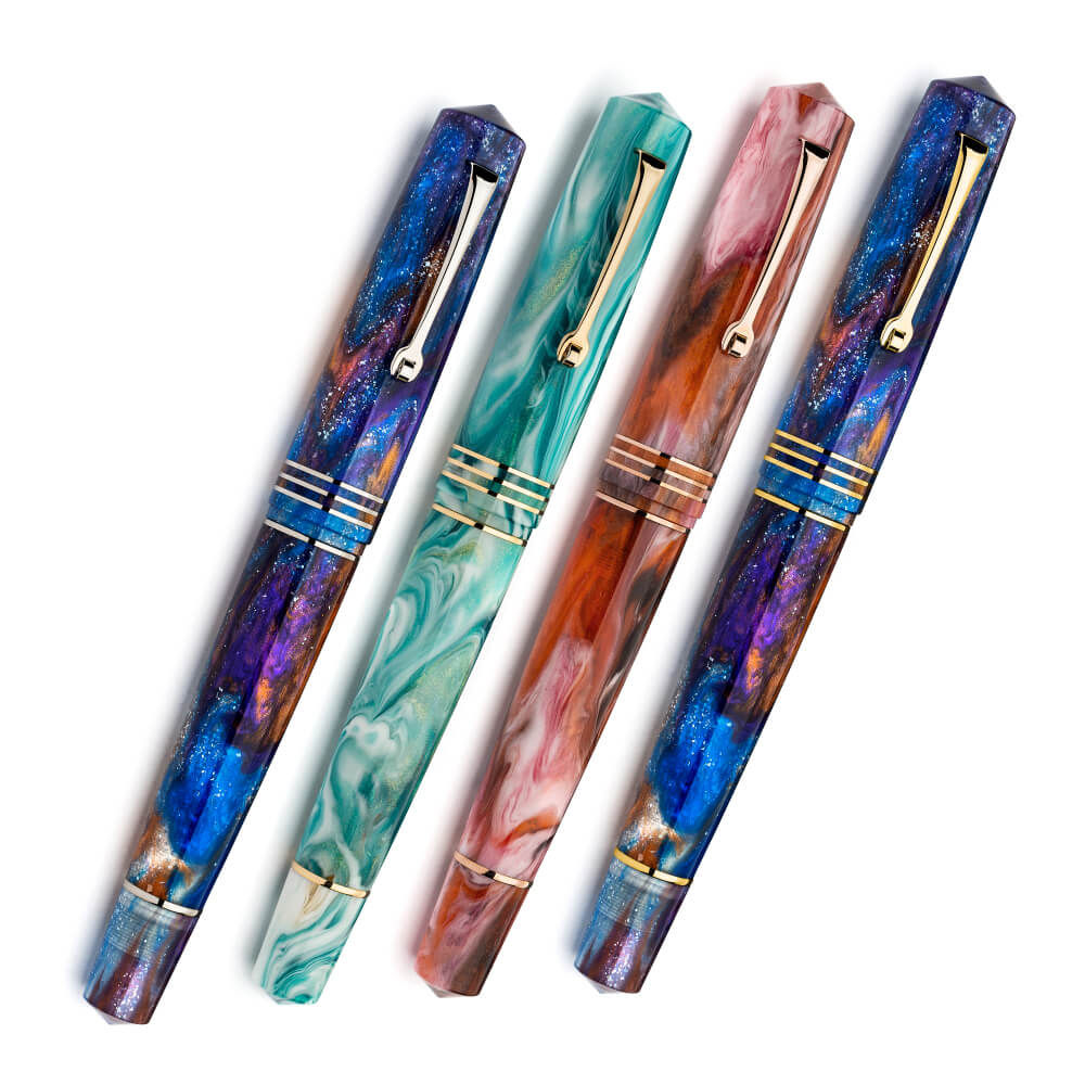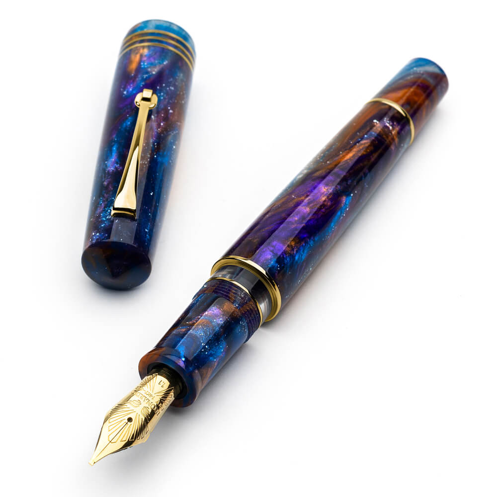 アメリカのカスタムペンメーカー「テイラードペンカンパニー」とコラボした〈モーメントゼロ グランデ2.0 ガラッティカ〉は、その名の通り「ガラッティカ」=「銀河」をイメージして製作されており、星の輝き、宇宙の深み、星座の陰影を想起させる3つのカラーバリエーションのレジンが、ヴィンテージスタイルのデザインに完璧に調和しています。 広大無辺な宇宙の色彩をイタリアの職人技で表現した意欲作です。
