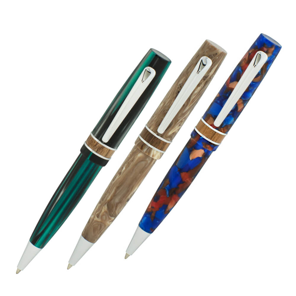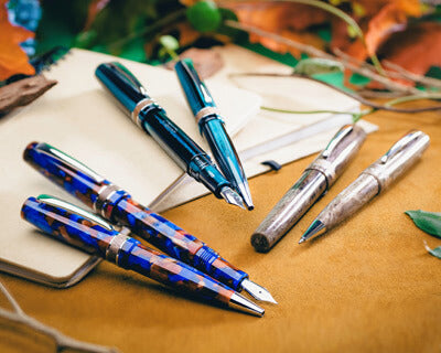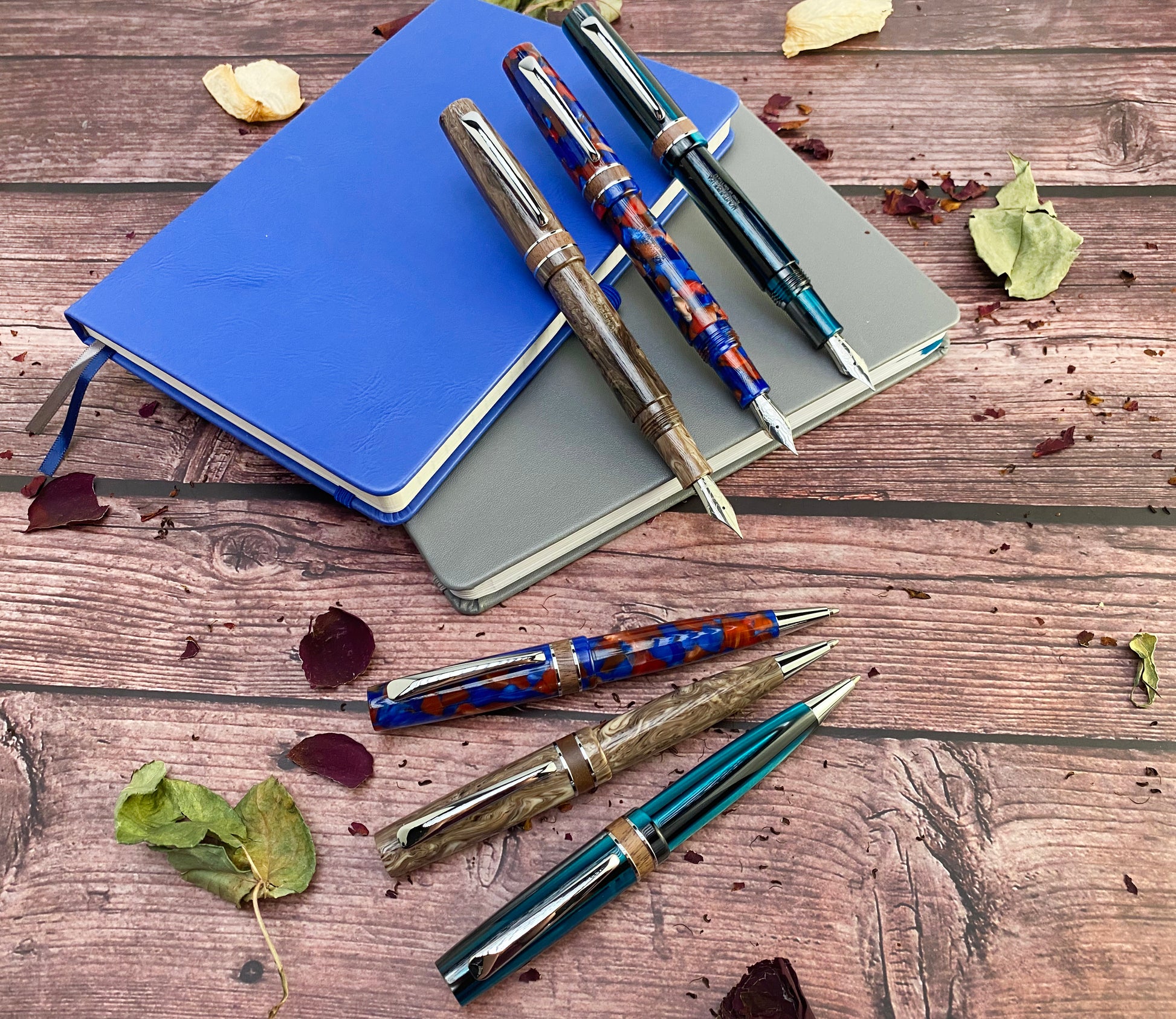 万年筆・ボールペンとも存在感のあるサイズで、キャップに配したウォルナット材のリングがナチュラルな雰囲気を高め、手に取るたび、自然とのつながりを感じさせてくれる筆記具です。