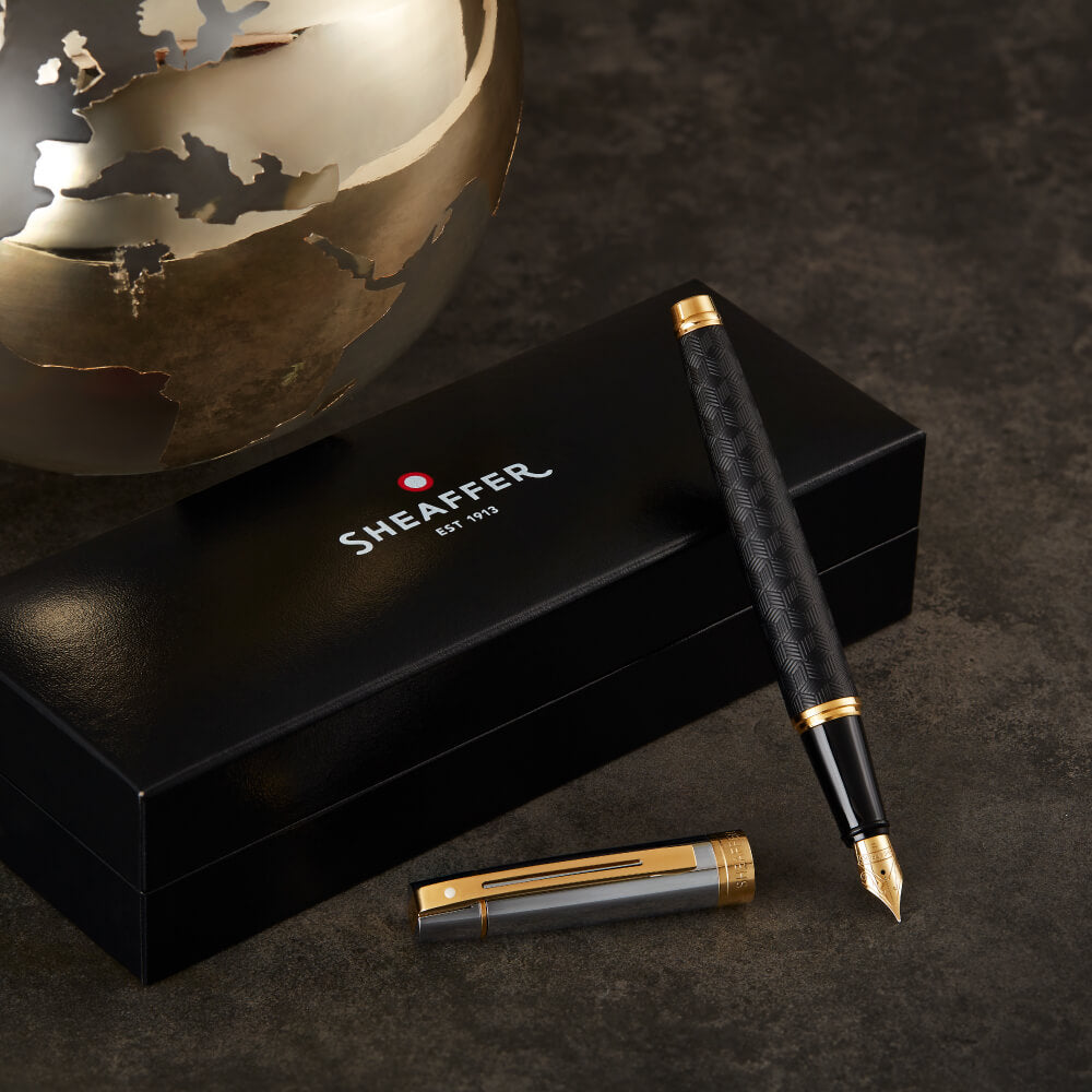 マットブラックの軸に特徴的なキューブパターンが彫刻された堂々とした佇まいで、光沢のあるクロームメッキのキャップと、ゴールドプレートが施されたステンレススチールのペン先が、ボディに刻まれた独特な模様を際立たせています。 高級感と個性を放ち、華やかなテイストをお好みの人におすすめしたい逸品です。