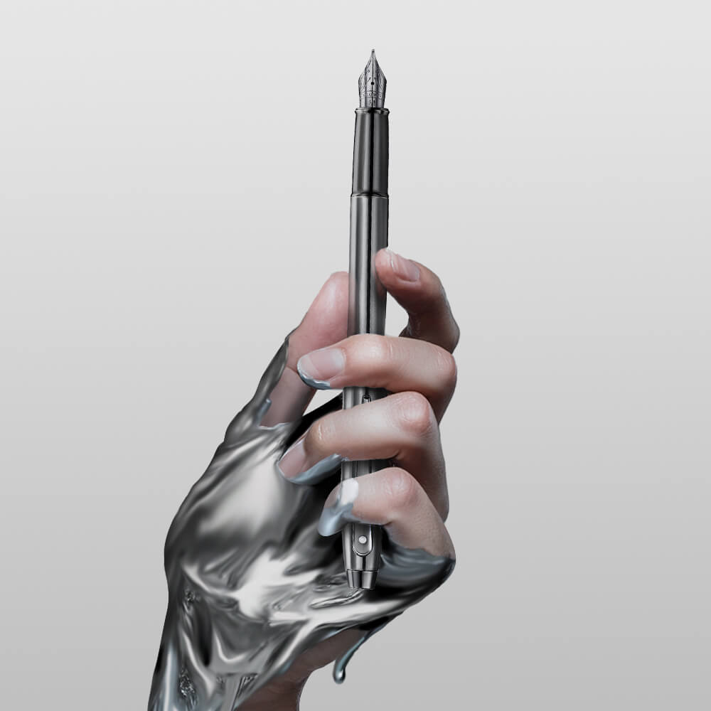 熟練した金属職人が溶けた鉄を形ある作品に仕上げるように、書くというシンプルな行為をエレガンスとインスピレーションの体験へ導くためデザインされています。目的をもった何かに変化するために金属が溶けた状態を表現したアイオニック。筆記具は単に書くだけのものではなく、変容と洗練の物語を伝える道具であるという