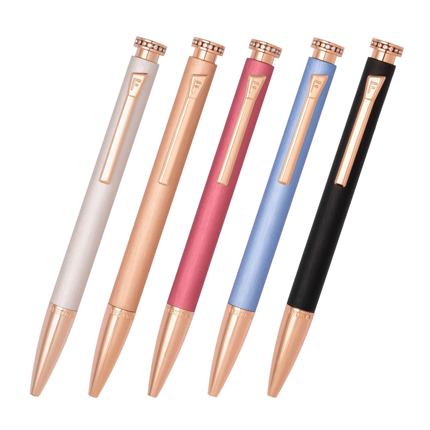 エレガントでモダンな女性をイメージしてデザインされました。 シルエットは滑らかでバランスが取れており、豪華なライトゴールドのトリムとブラッシュド(艶消し)アルミニウムのコントラストが絶妙です。クリップには頭文字のF、天冠上部にはフェスティナの紋章が刻印され、天冠を取り囲むクリスタルストーンが一層華やかさを添えています。