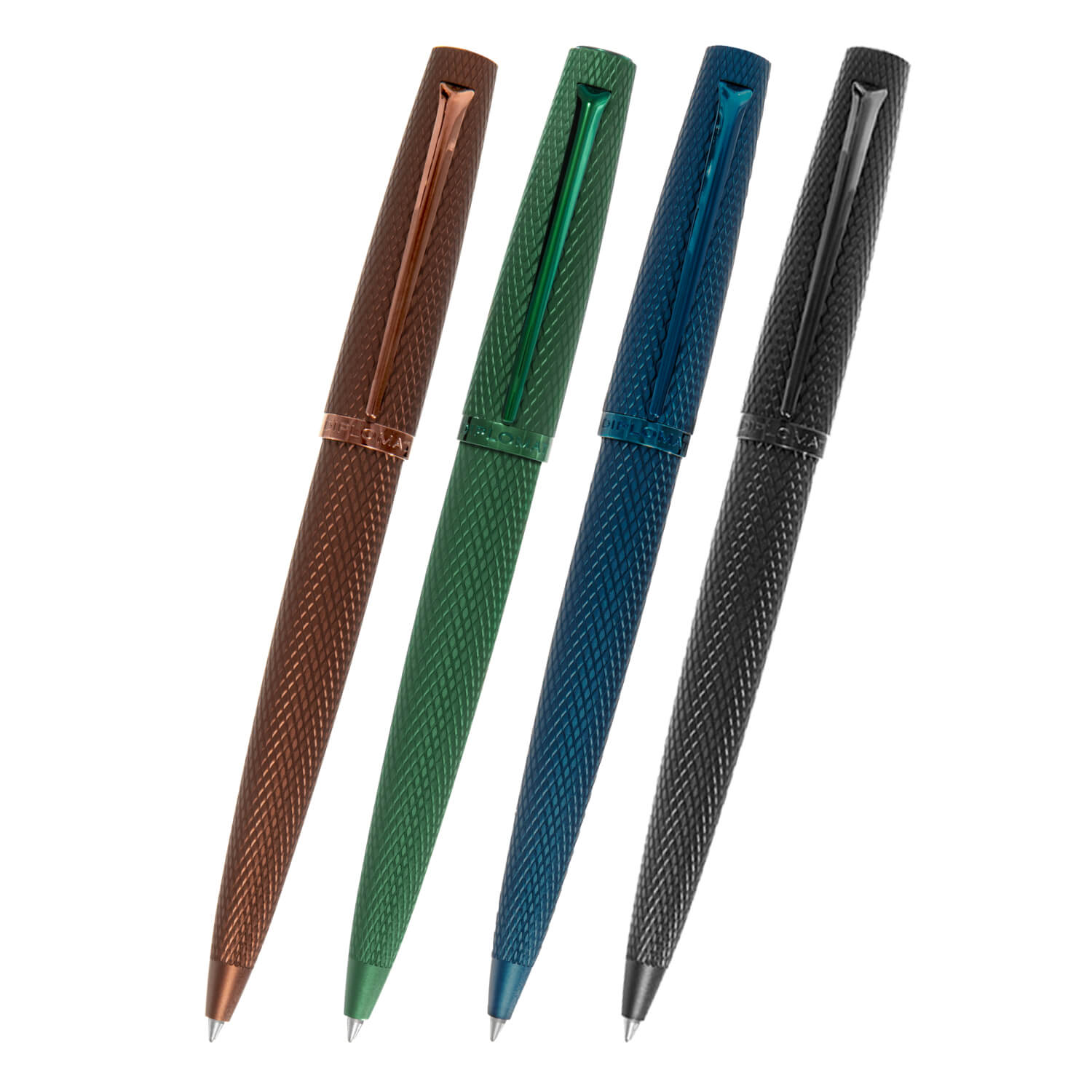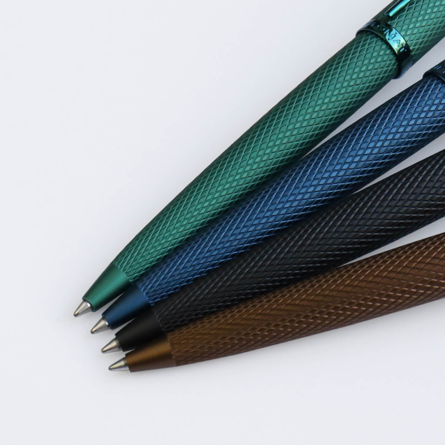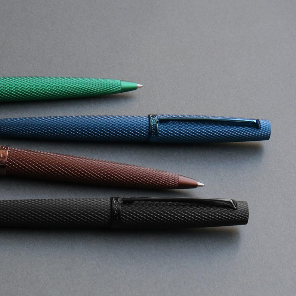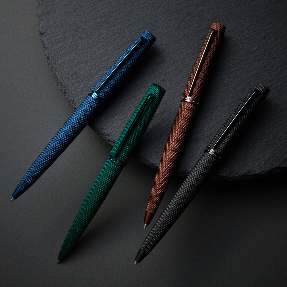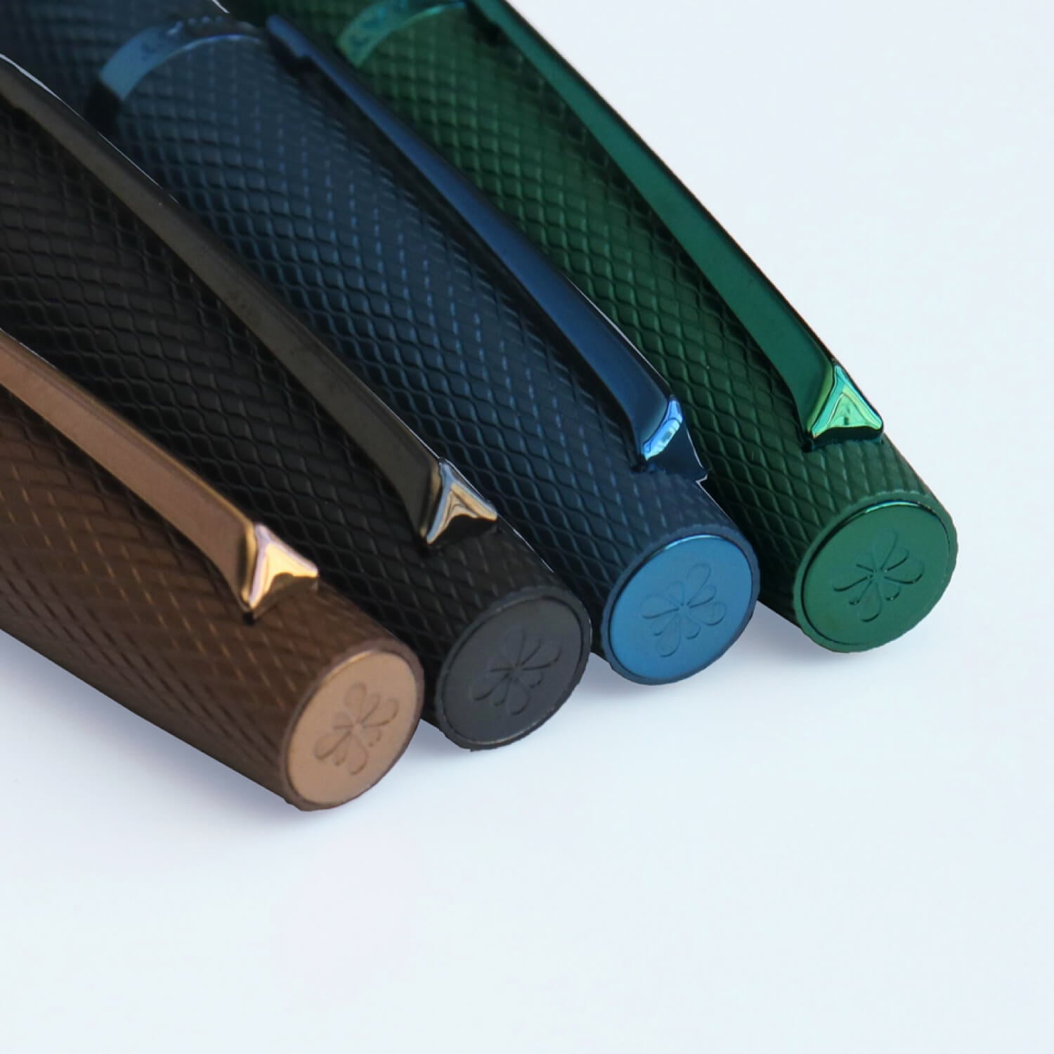 爬虫類のウロコを思わせるギロシェパターンの彫刻が全面に施されたアルミニウム製のボディが特徴的。アノダイズ加工のメタリックな風合いの仕上げとも好相性です。外観、品質ともに特別な筆記体験をお届けします。